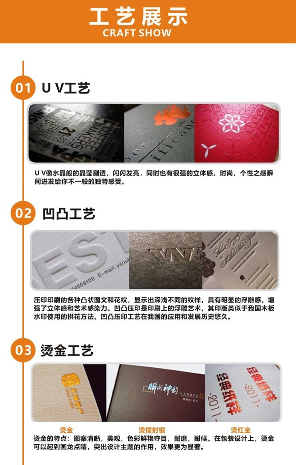 常用工藝:覆膜(啞膜、光膜)、壓紋、凹凸印、局部uv、燙銀、燙金、印專色(PANTONE色)、鏤空、鐳射、打孔、疊印、絲網印、透印、過光油、啞油等